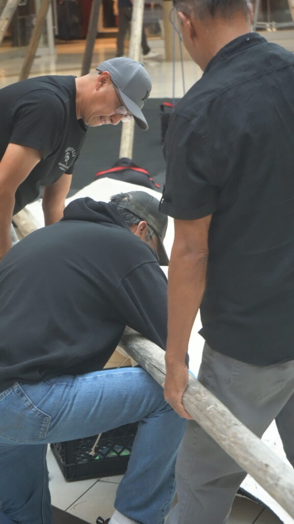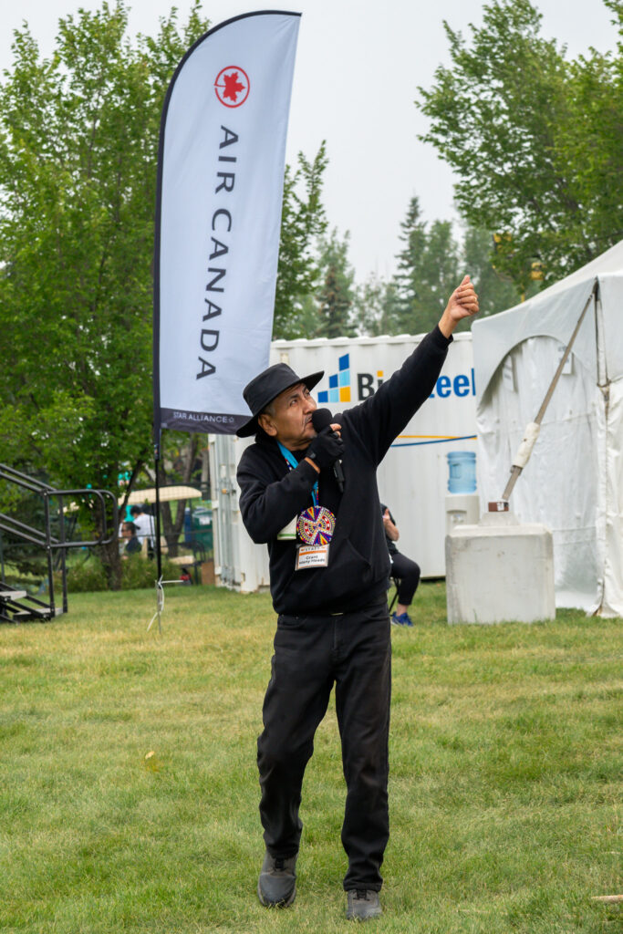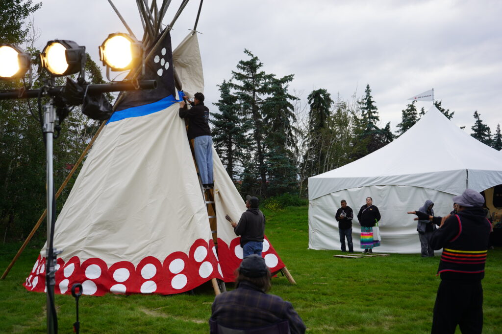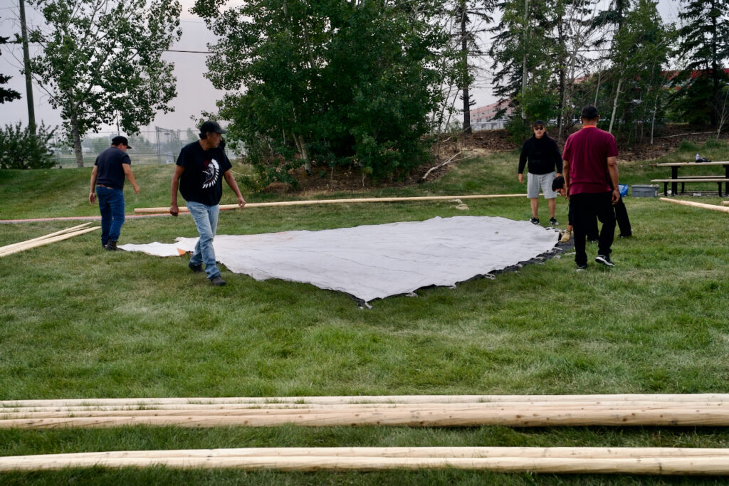 The Lodge (tipi) was then bundled up for waiting for its maiden unveiling at a planned transfer ceremony. A ceremony had been planned for late June in conjunction if Indigenous Heritage Month and the date of the signing of Treaty 7. However, inclement weather which was for most of June and July cancelled the opportunity of conducting the Transfer Ceremony until August, when the lodge was set up for the very first time at Elliston Park, opening night, Thursday, August 14, 2025. The lodge assembly ceremony was led by Grant Many Heads, who explained the process of setting a lodge (tipi) up. The importance of the 4 pole start, the doorway opening