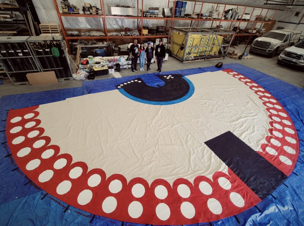 May 10 was drawing the design out on the lodge canvas and then beginning the painting process. It is not an easy task taking a paper drawing and then translating that to a 20’ canvas, which when spread out, took up a massive amount of space in our warehouse area. Over a period of two days, we engineered and drew out the design and then had a group of volunteers, board member families and staff complete the task of painting the entire exterior.